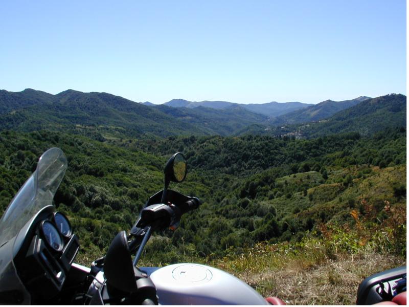 Dedico questo primo itinerario ad uno dei luoghi a me più cari, ad un passaggio motociclistico non troppo impegnativo ma che racchiude in circa 150 km. una varietà di scenari impressionante. Il mio punto di partenza è Genova, città nella quale vivo e lavoro. Seguendo dal centro cittadino le indicazioni per il Passo dei Giovi, vera e propria porta fin dall’antichità per gli scambi commerciali tra Liguria e Lombardia, si giunge alla periferia settentrionale della città e, per la precisione, nella circoscrizione di Pontedecimo. A questo punto si abbandona la città e cominciamo ad immergerci nel primo, lussureggiante verde dell’Appennino Ligure. Da Pontedecimo appunto, si segue la strada per Campomorone – Isoverde e quindi per i “Piani di Praglia”. Si tratta di un delizioso altopiano, famoso luogo di ritrovo, per le gite domenicali, delle famiglie genovesi.La strada per giungervi e ricca di curve e tornanti a salire, pulita ed in ordine. Ai “Piani” esiste un piccolo rifugio in cui è possibile rifocillarsi, sostando come prima tappa. Siamo a circa 20 km. dal punto di partenza del centro cittadino. Non rimane ora che seguire la strada. Si restringe, è vero, ma non conosce un traffico intenso ed offre emozioni alla vista , e di guida, uniche. E’ il punto in cui il confine con il Piemonte è più vicino al mare. Alcune curve e d infatti entriamo nella regione Piemonte ed in uno dei suoi parchi. Inutile parlare della flora particolarmente rigogliosa. Siamo a 1000 metri e pinete e querceti ci affiancano. A circa 30 km. dalla partenza siamo in un luogo denominato “Capanne di Marcarolo” (non chiedetemi l’etimologia del nome!). Una chiesa ed alcune case e poi un panorama che, in giornate particolarmente terse spazia dal Mediterraneo alle Alpi a corona della Pianura Padana! Non si incontrano altri centri o case isolate per circa 20 km. oltre se non le rovine dell’antico monastero della Benedica, tristemente famoso durante la Seconda Guerra Mondiale per un eccidio di partigiano perpetrato dai nazi-fascisti. Sorprendentemente lo scenario cambia ancora ed in maniera repentina, unica. Si passa infatti a percorrere una zona particolarmente brulla, aspra, un canyon con la strada a strapiombo su un piccolo ruscello. Siamo solo noi. Silenzio rotto dal nostro boxer che chiede ancora strada. Arrivati alfine ad un bivio (Bisio – Voltaggio) scegliamo quest’ultimo. Delizioso paesino sorge alle falde appenniniche prima della grande pianura. A questo punto non si ha che l’imbarazzo della scelta. Ed è questo il bello,no? Si può proseguire verso l’abitato di Gavi, rinomato per il suo vino bianco, oppure possiamo rientrare verso il capoluogo ligure attraverso due differenti passi. La “Bocchetta” o la “Castagnola”. Prediligo quest’ultima, forse un po’ più impegnativa. Assolutamente sconsigliata in inverno per la rigidità del clima. La Castagnola sbuca sulla già citata strada del Passo dei Giovi. A questo punto non ci resta, dal paese di Borgo Fornari, che seguire le indicazioni per Genova che dista circa 40 km. Di curve e tornanti, ovviamente! Fabrizio