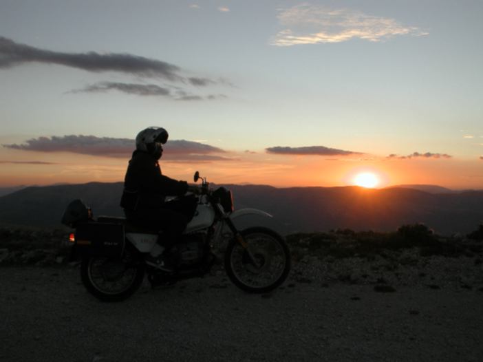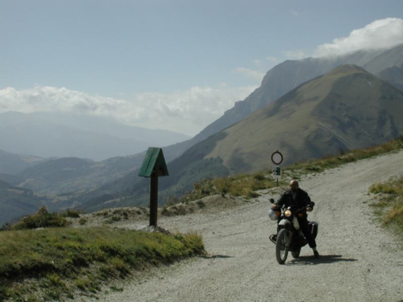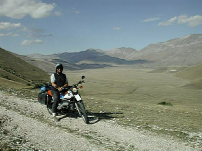 Guardo il programma dei miei impegni lavorativi e mi accorgo con sgomento l’8 ed il 9 settembre rappresentano il mio ultimo week-end libero da impegni di lavoro-congressi-riunioni-turni per un bel pò di tempo. In breve tempo prendo la decisione di passare questi due giorni a cavallo della moto in compagnia di Simonetta. Organizziamo la “fuga” e decidiamo che la meta saranno i Monti Sibillini, massiccio montuoso dell’Italia Centrale che si sviluppa nel punto di unione fra Marche, Umbria e Lazio. Decido di arrivare in loco passando da Città di Castello, Perugia, Foligno e quindi Norcia. Tutto il primo tratto di strada, fino ad Assisi, segue il percorso della superstrada E 45 Cesena-Roma. Pur essendo un percorso stradale fortemente trafficato, permette di passare attraverso belle zone di alta collina ed impressionanti cavalcavia nella zona di Verghereto ed Alfero, dove la Romagna diventa Toscana. Norcia è uno splendido, piccolo paese ai piedi dei Sibillini, con una meravigliosa piazza centrale (FOTO 1) piena di importanti monumenti storici e caratteristici negozi che offrono singolari prodotti di “norcineria”, appunto (FOTO 2). Da qui, l’itinerario seguito ricalcherà il più possibile quello descritto in un articolo di Airone di Aprile 1983 (essì, sono così vecchio da avere tutta la collezione di Airone dal primo numero). Da Norcia, la strada si inerpica seguendo bellissimi tornanti, in direzione Castelluccio. Arrivati a circa 1000 metri di altitudine, circondati da monti brulli e maestosi, la strada giunge ad una specie di valico ed inizia quindi a scendere verso il “ Pian Grande”: si tratta di un immenso altopiano che si estende per circa 1300 ettari per lo più destinati a pascolo (FOTO 3). La lunga stagione secca ha trasformato questa piana immensa in una specie di deserto di stoppie giallastre circondato da alture spoglie dalla cima rotondeggiante che danno al luogo un atmosfera del tutto particolare ed estremamente esotica (FOTO 4). Il piano è spaccato in due da una lunga strada perfettamente rettilinea (FOTO 5) che ricorda le infinite strade di certi deserti americani. Da qui si procede in direzione nord toccando i piccoli centri di Gualdo, Castelsantangelo sul Nera, Visso ed Ussita. La strada è quantomai varia con salite e discese, curve e tornanti in un rapido susseguirsi di paesaggi boschivi davvero selvaggi. Assicuratevi di avere il serbatoio pieno uscendo da Norcia, perchè fino a Visso non si trovano distributori di carburante. Dopo una breve sosta nella vivace cittadina di Visso (FOTO 6), continuiamo il nostro percorso sempre seguendo l’itinerario proposto da Airone, ma una bella sorpresa ci attende. Da Ussita, la strada taglia di traverso il gruppo montuoso verso il piccolo centro di Bolognola passando da Casali. Fatico non poco per trovare l’indicazione per questo ultimo borgo ma alla fine imbocco la stradella che, dopo circa 4 chilometri, finisce contro una piccola pensione. Mentre siamo fermi sulla moto a ragionare sulla cartina, un “indigeno” del posto si avvicina e, in perfetta cadenza marchigiana, ci dice che, per arrivare a Bolognola bisogna “ andare in sopra alla muntagna ( circa 12 km di strada bianca “non brutta”); al cascinale sulla vetta pieghi a destra e poi vai per prati ( circa 4 km di strada “ non bella”)”. Un pochino perplesso, domando se è una strada fattibile in moto e lui, guardando la G/S, dice “bisogna essere un pò sportivi, ma questa qui nun cià mica paura...” Alla fine decidiamo di tentare, anche se il sole sta scendendo rapidamente verso l’orizzonte (FOTO 7). Il primo tratto di strada fino al cascinale, un ricovero per pecore, è effettivamente di strada bianca ricoperta da uno sbrecciato fine che consente una andatura di 40 km/ora ma che non concede distrazioni per i numerosi tornanti ed, a tratti, la forte pendenza. Dal cascinale in poi, la “ strada” si fa davvero impegnativa e mette a dura prova la moto, le braccia ed il sangue freddo del pilota (FOTO 8); il percorso risulta essere non di 4 ma di 14 km ed è formato da uno stretto viottolo con tratti in forte pendenza sia in salita che discesa, fondo stradale irregolare a volte formato da ciottoli grossi come un pugno, a volte da massi affioranti da terra battuta ed a volte da lunghe e profonde crepe che attraversano tutto il sentiero e, quindi, non evitabili. Il tutto in un paesaggio assolutamente lunare, desolato, maestoso e decisamente inquietante anche in ragione del fatto che oramai solo il faro anteriore della moto illumina questa delizia di stradella. Nonostante il sottile senso di angoscia che ci ha accompagnati per i circa 40 minuti della “traversata” devo dire che questo tratto del percorso, da solo, vale il viaggio. E’ buio pesto quando, finalmente, i Metzeler riprendono a mordere l’asfalto di una strada urbana. Nel frattempo si è alzato un vento a raffiche a tratti furioso che ci porta a trovare quanto prima “ rifugio” per la notte. Ci fermiamo a Sarnano, centro termale che conserva un centro storico medioevale pressochè intatto. Al mattino, con ancora negli occhi e nelle braccia il ricordo della strada percorsa la sera precedente, riprendiamo il giro dirigendoci a sud toccando le cittadine di Amandola, Montefortino e Montemonaco. Da quest’ultimo paese, risalendo per 5 km una sterrata che ci porta in breve a circa 1500 msm si arriva al “Rifugio Sibilla” dal quale si gode dello spettacolo mozzafiato dato dal panorama della vallata e degli alti monti circostanti (FOTO 9, FOTO 10). Con questo ultimo spettacolo, si conclude il nostro giro ( in tutto 740 km) dei Sibillini: la strada del ritorno ci porta a pranzare sulla riva del mare a Porto S. Elpidio (FOTO 11) e da qui tutta autostrada, con pioggia torrenziale da Falconara a Rimini sud... Non si finirà mai di benedire le tute da acqua.